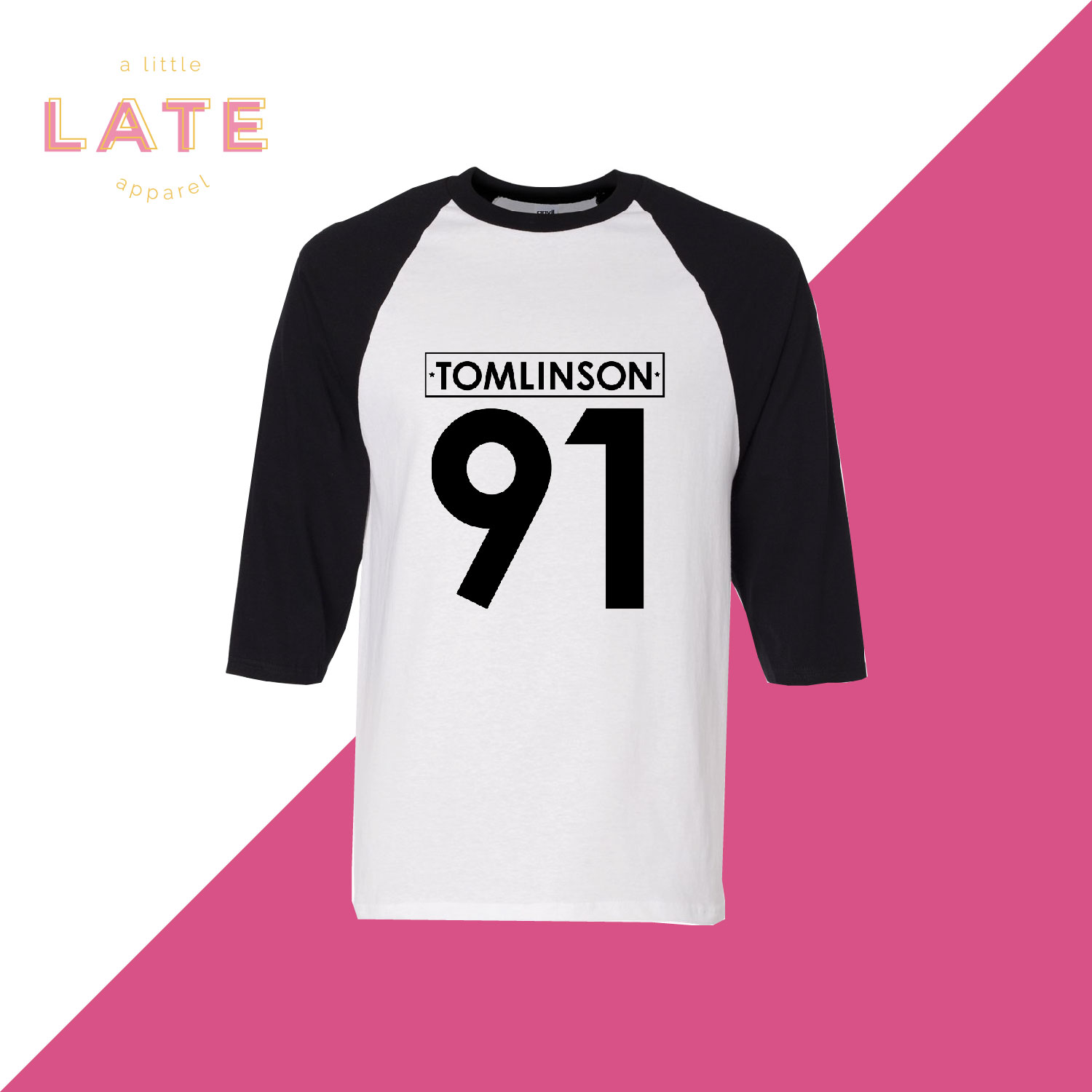 One Direction // TOMLINSON baseball tee The design is on the back. The front is plain. - 3/4 sleeve baseball tee made with a soft cotton jersey fabric -loose fit - design will be placed on the back of the shirt Sizing chart: S: 33-35" M: 36-38" L: 36-38" XL: 39-40"