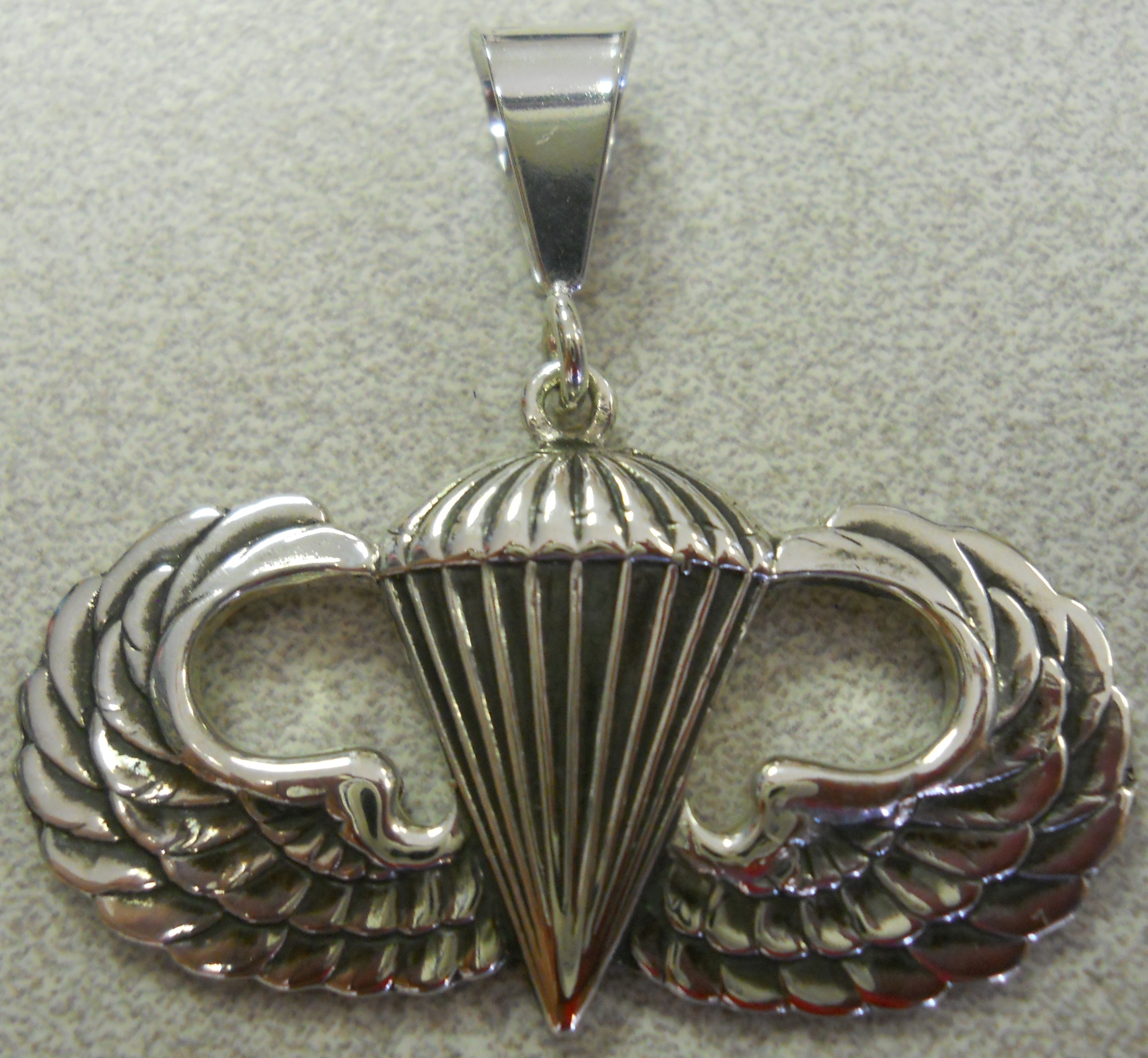 US Army Airborne Basic Parachutist Jump Wing Pendant, Cast in 8.4gms of solid sterling silver, these were cast from an actual set of Jump Wings so they are full size. Made in my studio in Shreveport, La.