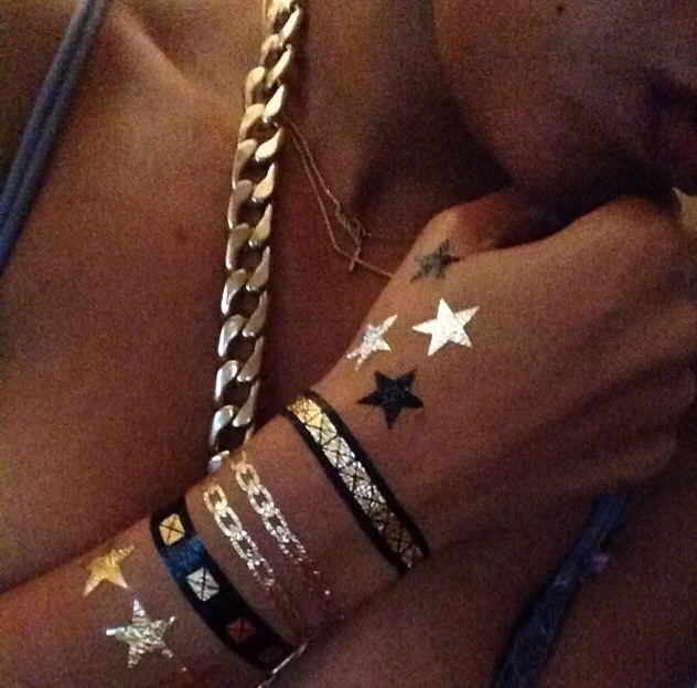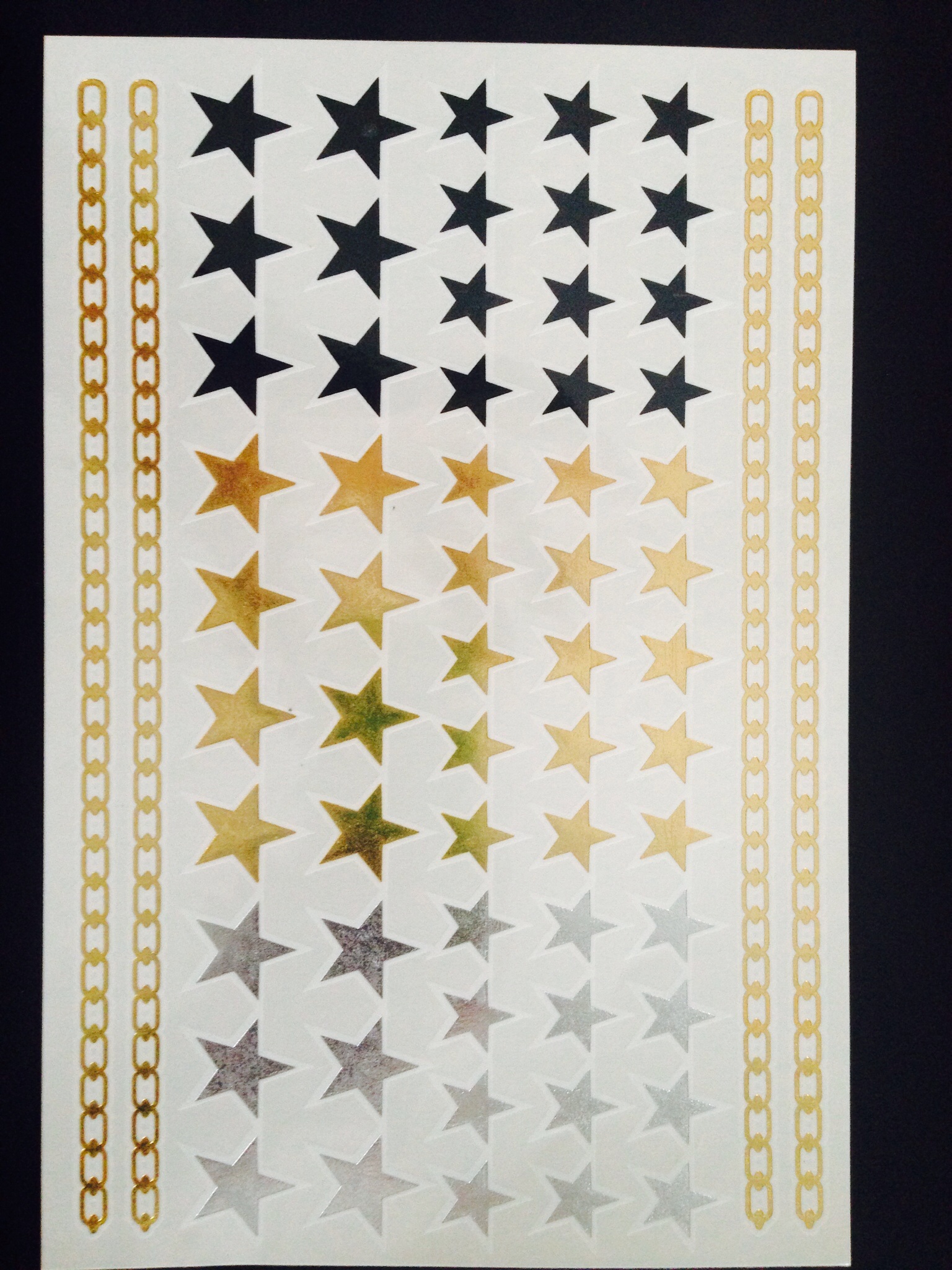 Full sheet of Black, Gold, & Silver Stars and Chains. Flashy accents designed to create your own look. Just apply, glimmer and go! POPGlam Tattoos will last about 4-6 days depending on where they are placed and how well you take care of them. Avoid any soap, sunscreen, lotions or oils near or on your tattoo. These types of oil based substances will begin to degrade the adhesive and dull your flash.